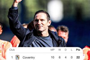 兰帕德的球队近4场比赛豪取4连胜且1球没丢,4场一共打入14球:3-0伯明翰、4-0米尔沃尔、5-0谢菲尔德星期三、2-0布莱克本。目前6胜4平的考文垂以22分力压米德尔斯堡,领跑英冠。