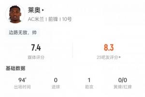 体育资讯11月3日讯 意甲第10轮比赛,莱奥送出助攻,帮助米兰主场1-0击败罗马。